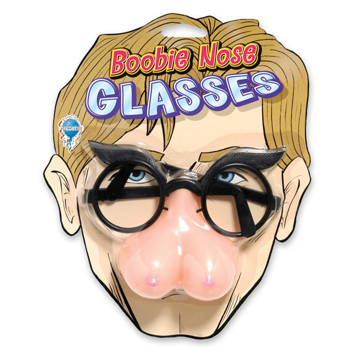 Black round rimmed glasses frames with attached bushy eyebrows and a pair of boobies for your nose.