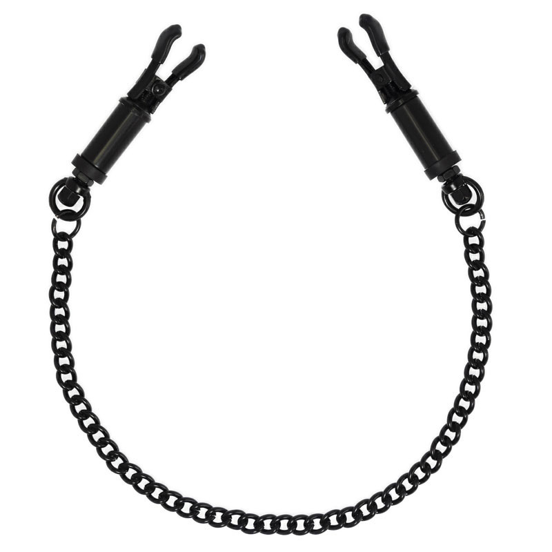 Black nipple clamps and chain that are adjustable by simply twisting the clamp.Color: BlackBrand: Rimba Code: 1191-105 Category: Nipple Clamps